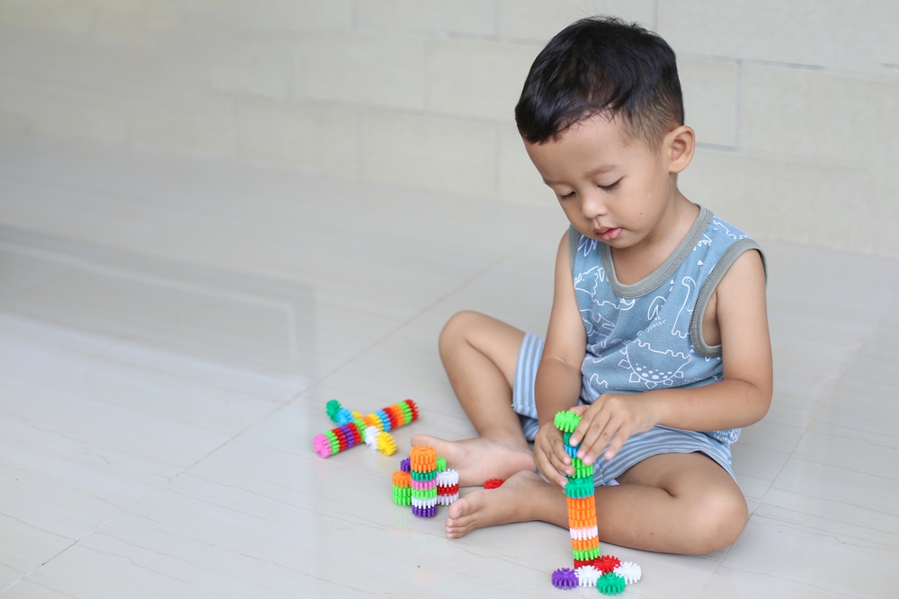 Focused,Asian,Toddler,Boy,Playing,With,Colorful,Interlocking,Gear,Building